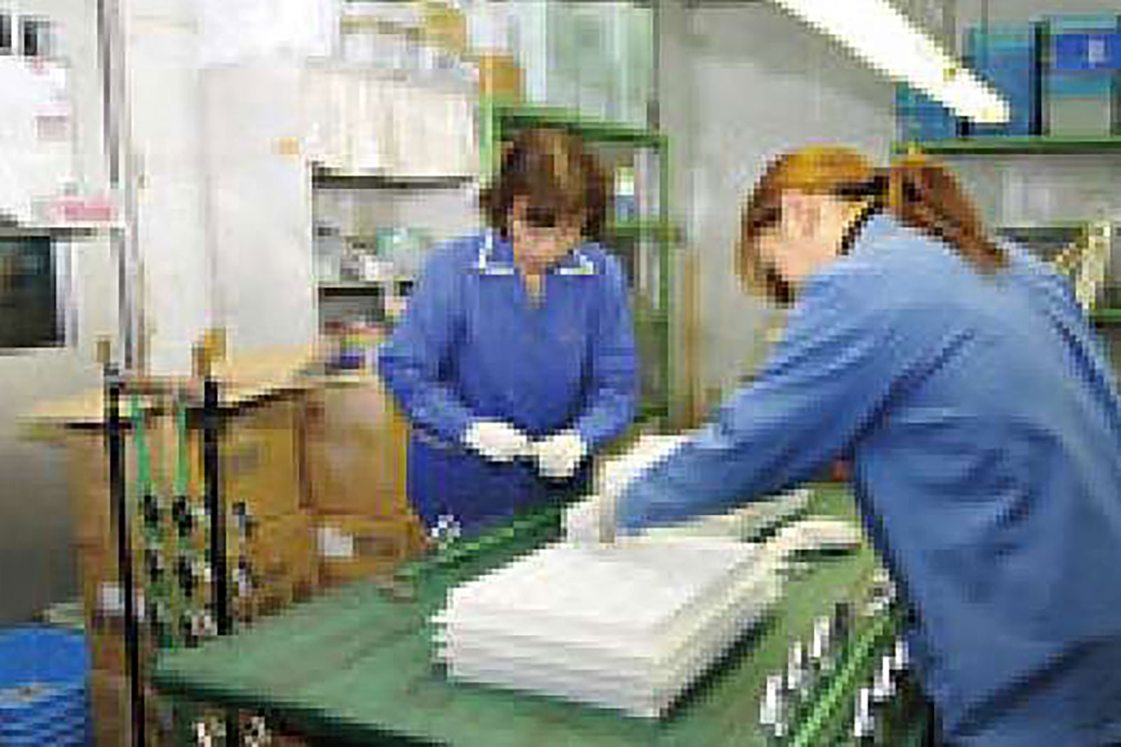 当社は、銅・ニッケル・クロームなどの自動めっき装置をはじめ、各作業ラインのFA化に積極的に取り組んでいますが、作業の特性から人手を必要とする工程もあり、常に精度の高い製品をつくるため、各作業ラインのチームが結束して作業に従事しています。徹底した品質管理のもと、一連の作業ラインを経てめっき加工され、最終工程で検査後出荷されます。